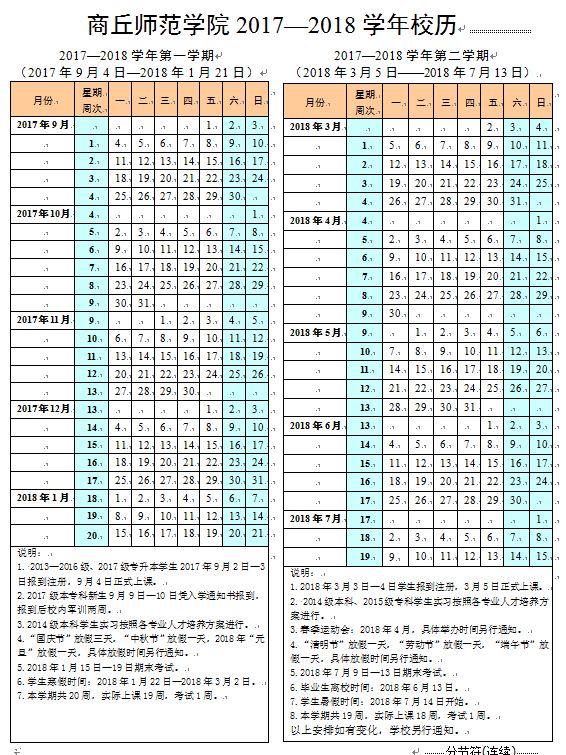 商丘师范学院2017—2018学年校历