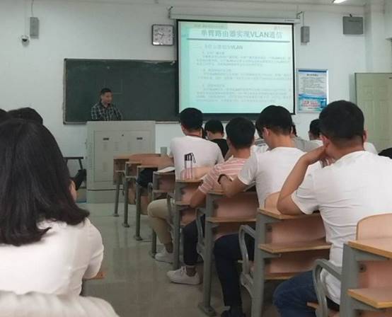 课前,康鲲鹏老师向大家展示自申请范式改革项目以来的泛雅平台的建设情况,并现场登录到泛雅平台,给大家展示了平台上的课件、视频、实验包以及以往讨论的内容、作业等。教学开始后他采用翻转课堂教学方式,简单介绍了本次课的内容,然后将课堂交给了同学们,同学们根据课下通过学习通登录泛雅平台预习的内容,以任务为驱动,采用递进的方式在Packet Tracer上演示并讲解了单臂路由器实现虚拟局域网间通信的实验。期间,康鲲鹏老师对学生的讲课和实验做了指导。